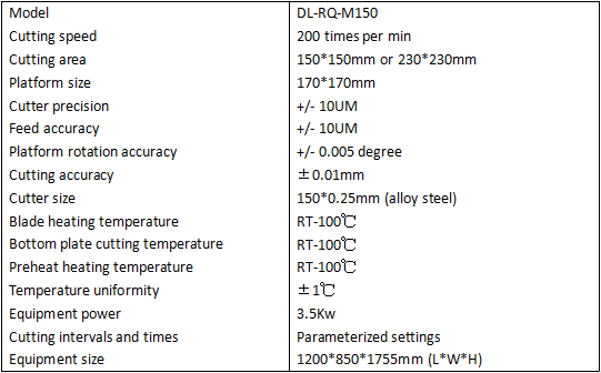 The DL-RQ-M150 heat cutting machine is an essential component of the electronic ceramic LTCC (Low-Temperature Co-Fired Ceramic) production line for slicing. It is used to cut well-stacked green bodies according to cutting lines into mosaic or continuous array products before sintering. Only after the heat cutting machine has performed the online cutting according to the specified size and specifications can the products enter the high-temperature furnace for sintering. The green tape produced after hot cutting is free from scatter, without burnt edges, and remains continuous without breaking, thus achieving exceptionally high-quality results as required.